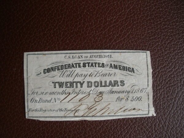 For sale is a rare 1861 CONFEDERATE STATES OF AMERICA $500 PROMISSARY NOTE – $20 BOND COUPON from Richmond, Virginia. This bond coupon is in excellent condition. This confederate bond paid an eight percent interest rate. The print on the note reads: “C.S. Loan of Aug. 19, 1861 – The Confederate States of America WILL PAY TO THE BEARER TWENTY DOLLARS for Six Months Interest due January 1st,. 1867. On Bond No. 1103, payable to the Treasury of the Confederate States”. The bond is hand signed. This small bond coupon measures about 1 1/4 inches by 1 1/3 inches. An amazing historic collectible.