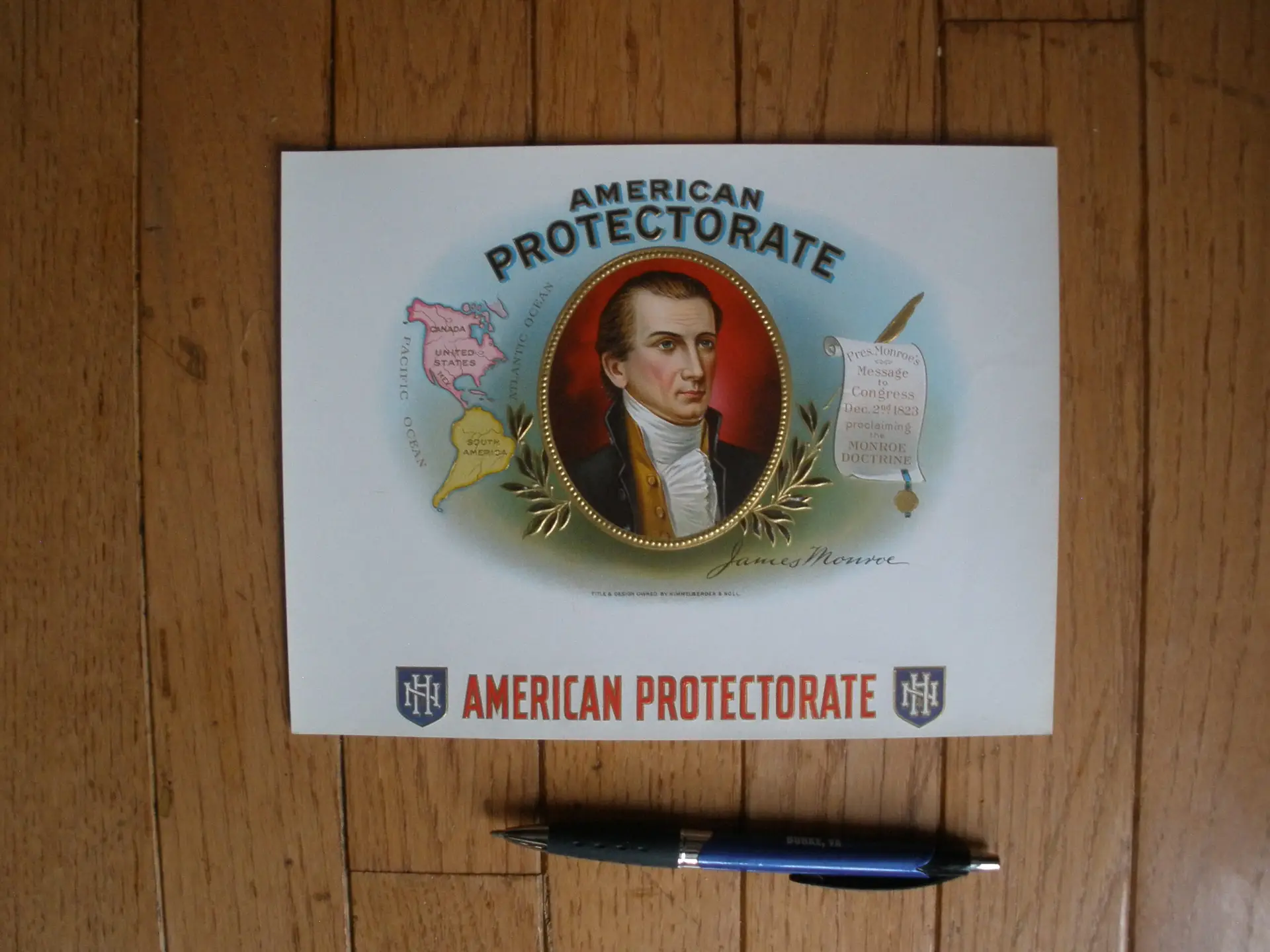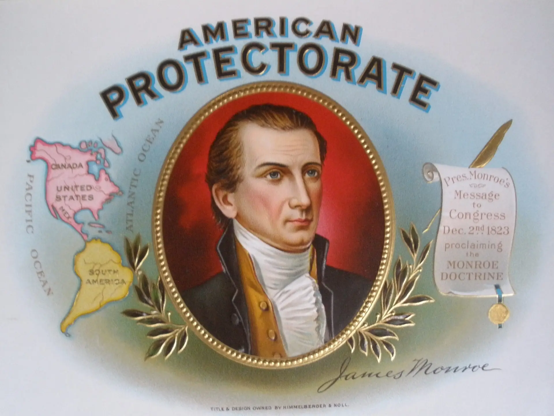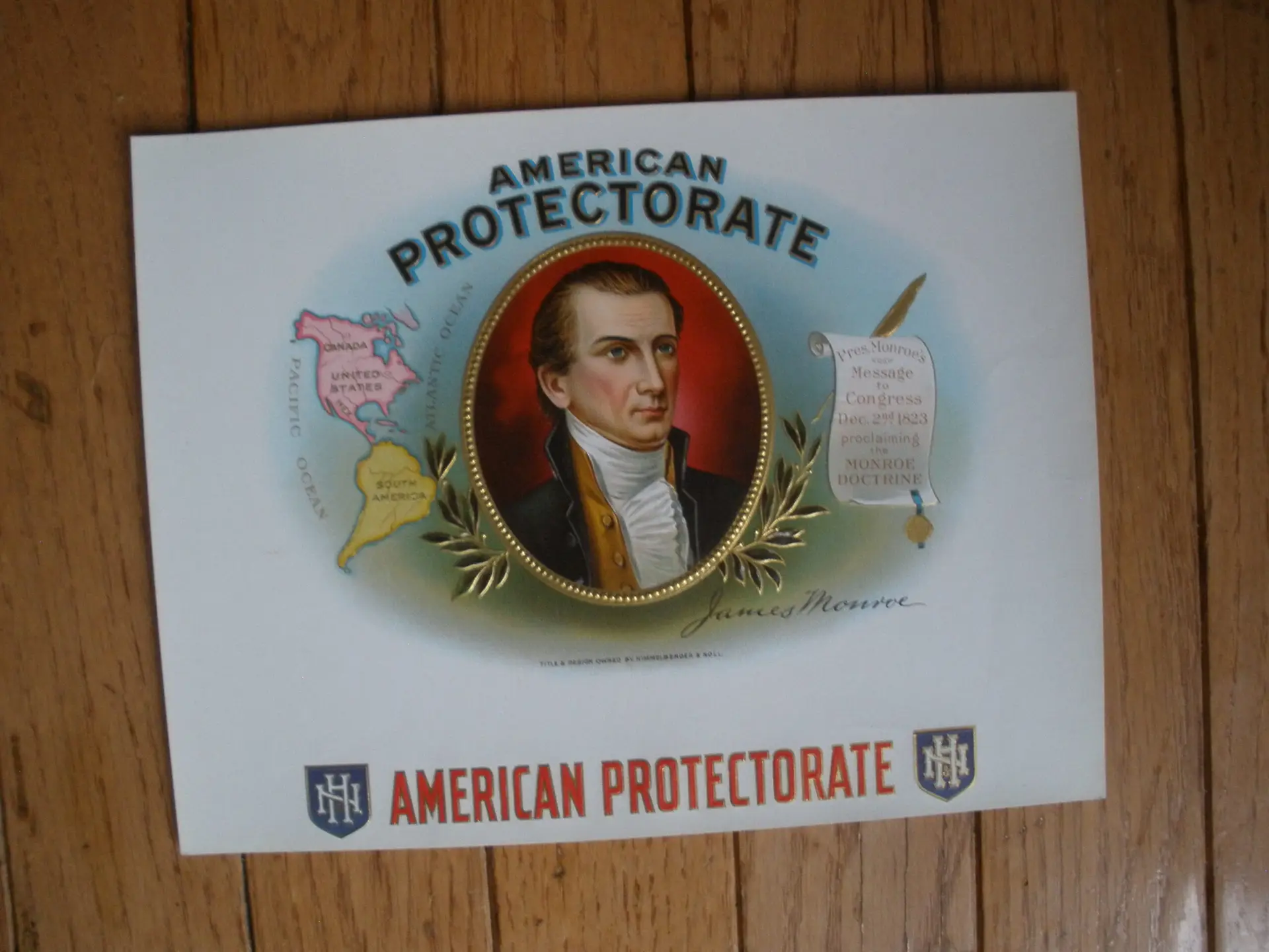 For sale is an original 1910 JAMES MONROE AMERICAN PROTECTORATE CIGAR BOX LABEL. This cigar label features a picture of President Monroe and his infamous 1823 foreign policy proclamation to Congress. The Monroe Doctrine declared the Western Hemisphere off-limits to future European colonization and intervention, asserting U.S. opposition to any new European attempts to control or influence independent nations in the Americas, while promising U.S. non-interference in European affairs. The label measures 8 1/2 inches by 6 5/8 inches. Perfect for collectors of vintage cigar labels or history enthusiasts, this item serves as a tangible piece of American political history.