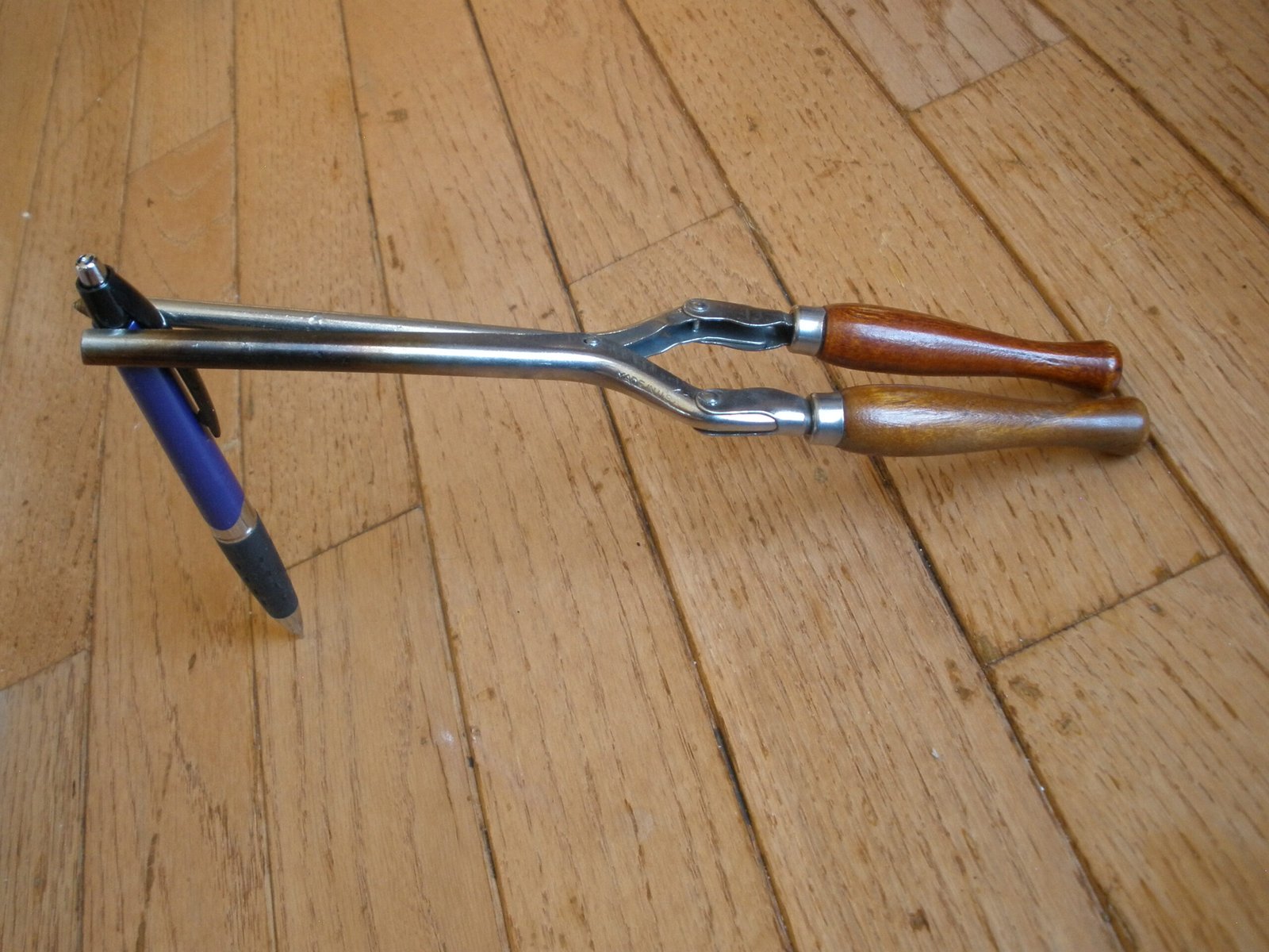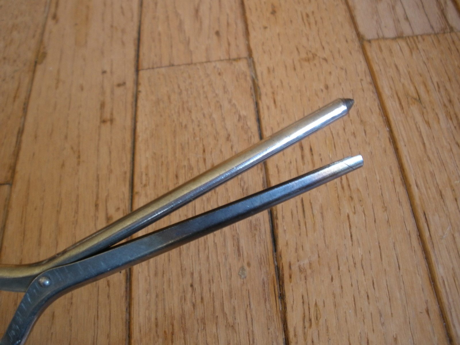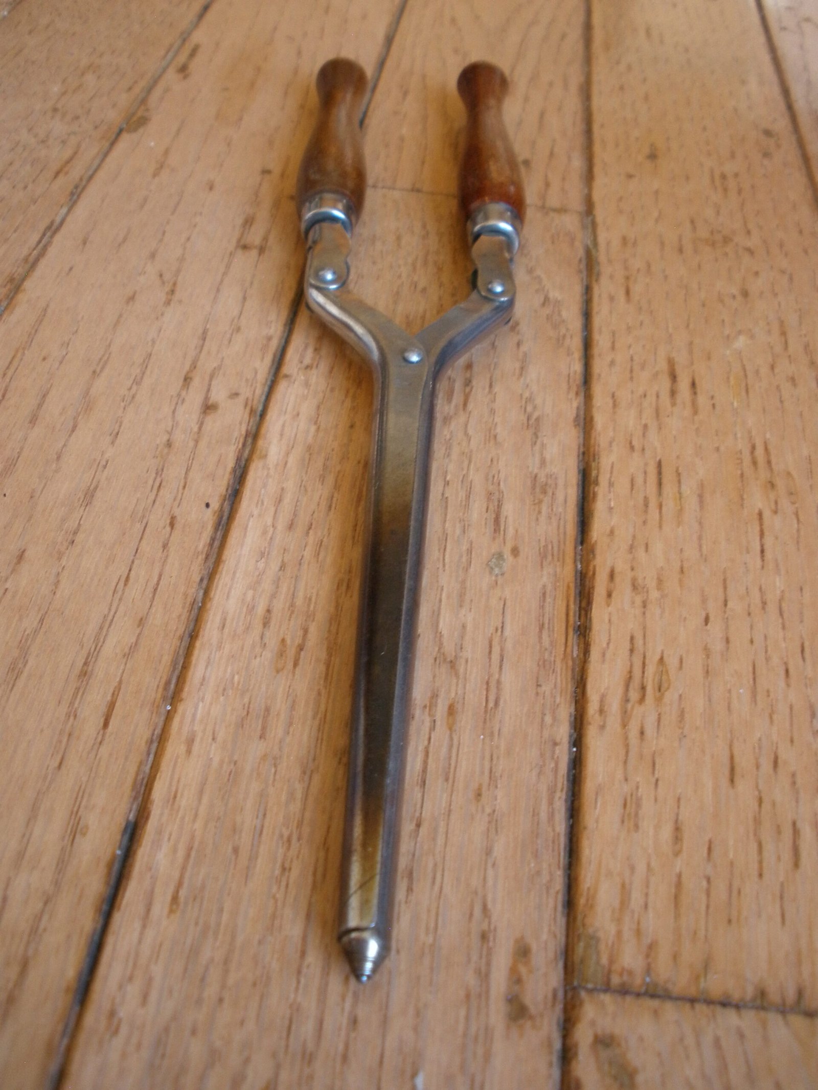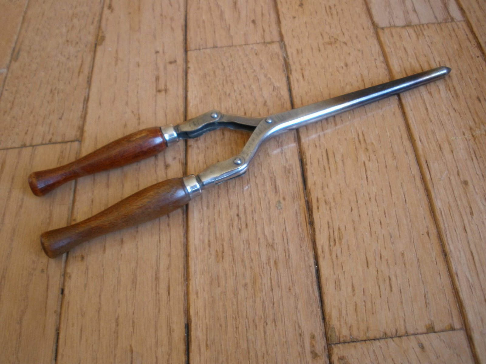 For sale is a 1920s BARBER SHOP HAIR CURLING IRON from an unknown manufacturing. The metal tongs open and close by squeezing the wooden handles. This primitive grooming device probably dates to the 1920s because these devices became obsolete after electric power in homes became common place. This beauty shop hair curler measures about nine inches in length. Just because your camping in the woods doesn’t mean that you shouldn’t give your handlebar mustache a fancy pincurl. An interesting barber shop collectible.