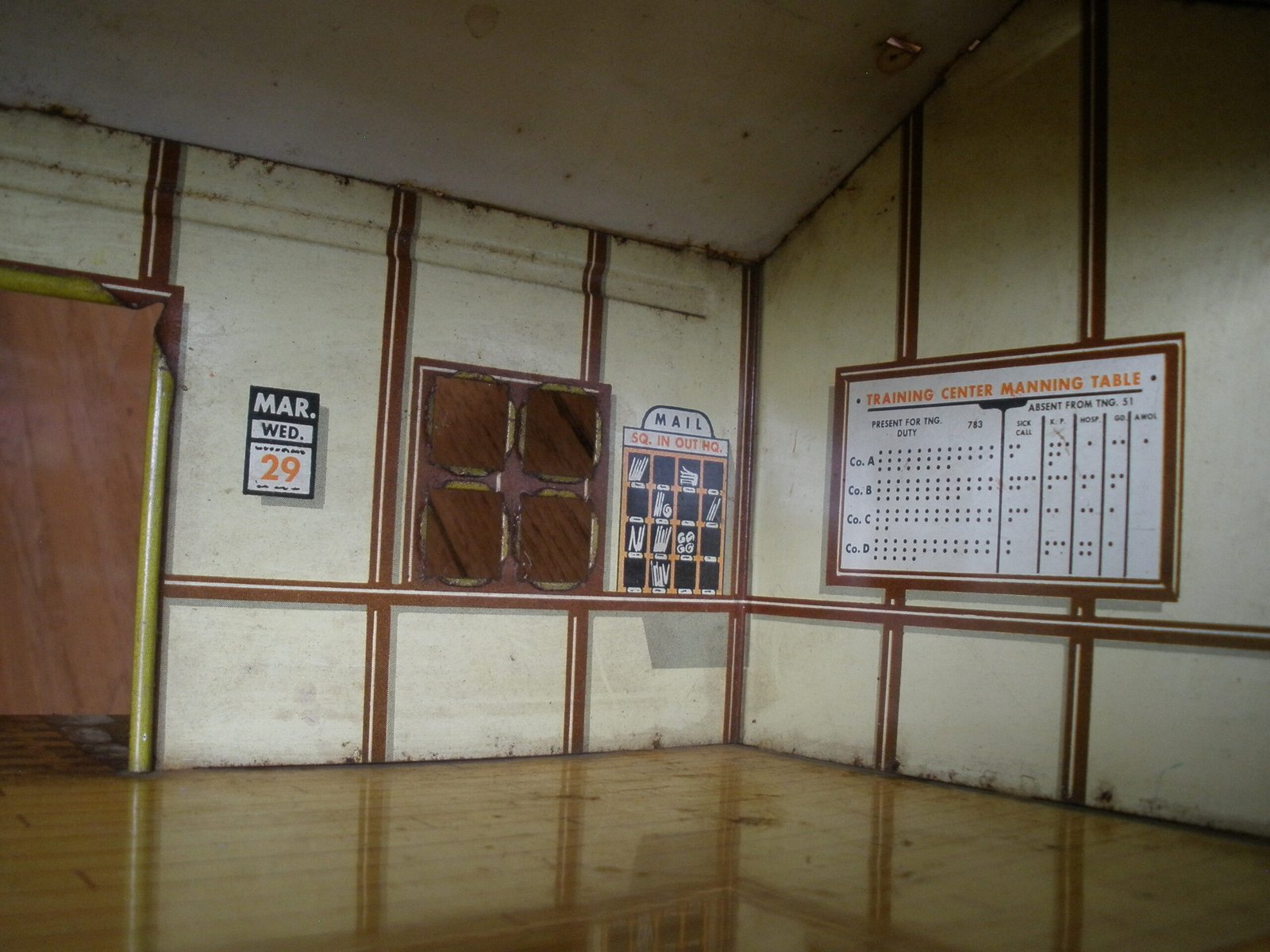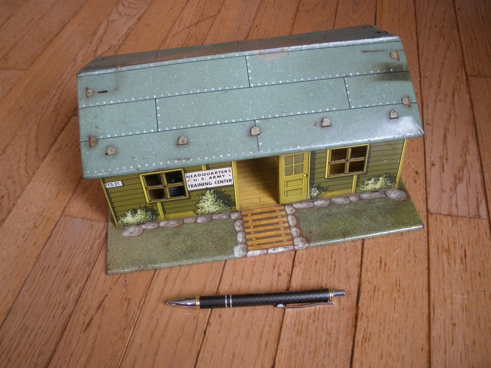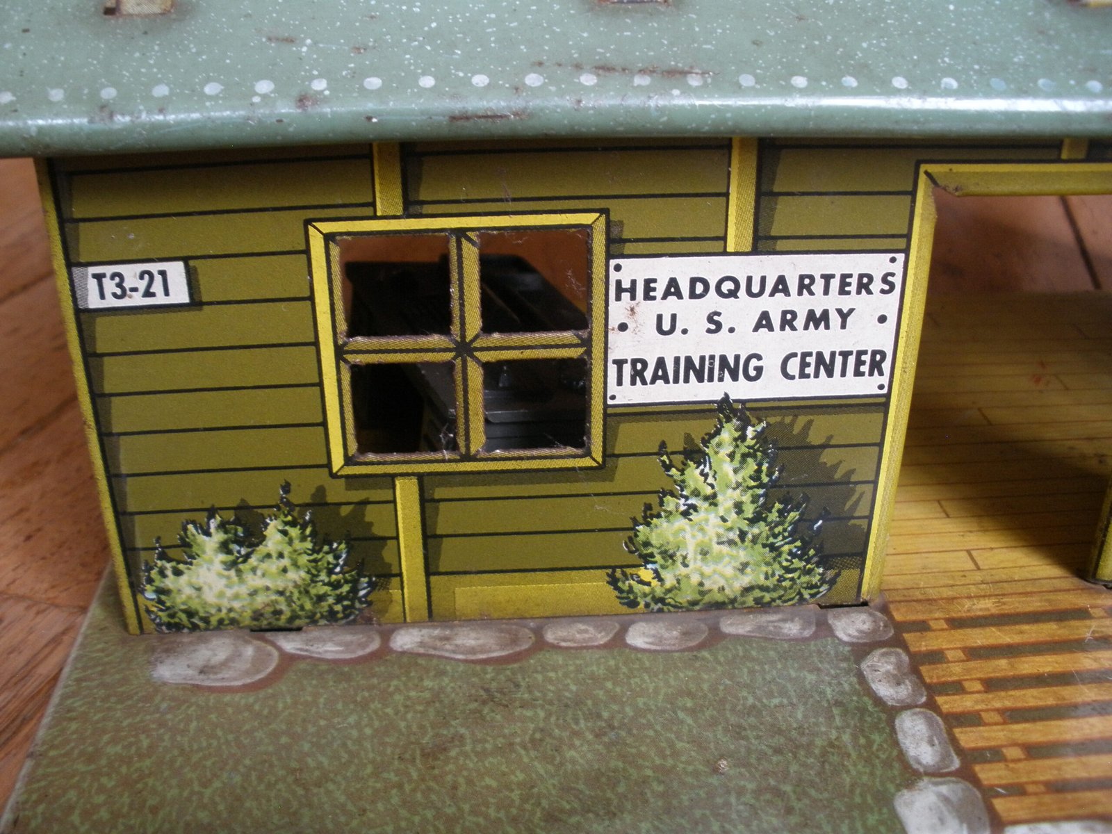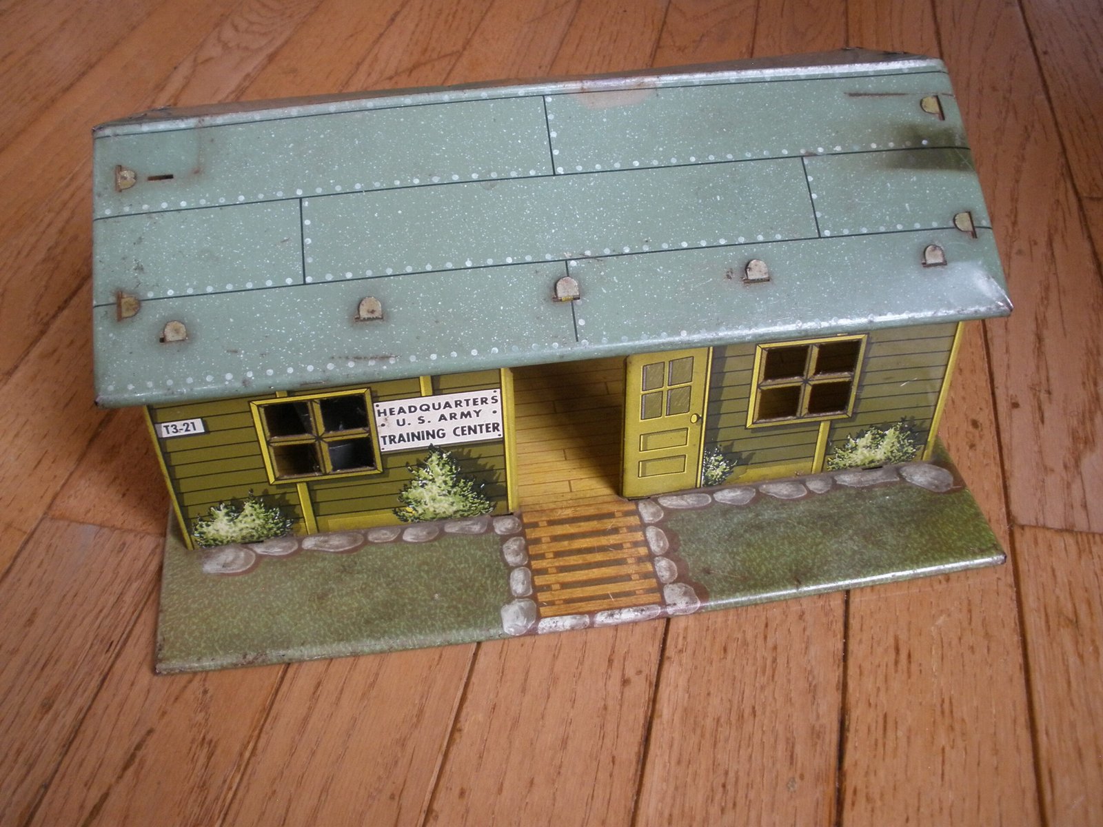 For sale is a 1950s MARX US ARMY HEADQUARTERS TRAINING CENTER Model T3-21 made by the Louis MARX toy company. This military themed lithographic toy is in very good condition with vivid color and a small amount of spot rust. The sale includes a green plastic toy desk with a typewriter on top of the desk. This desk was sold as one of the accessories which was included with the purchase of the Marx HQ Training Center. As you would expect, the Training Center accessories are significantly harder to find then the Training Center building. On the interior of the model training center the graphics on the wall include a Manning Status board, mail box slots, a fire extinguisher and a calendar. The graphics are very detailed. For example, on the manning status board, a soldier from Company A is marked as “AWOL” which stands for Absence Without Leave. More disturbing is the fact that all four Companies have personnel admitted to the hospital and there is a total of 16 soldiers on K.P. duty. In the Army, “KP duty” (Kitchen Police or Kitchen Patrol) refers to the task of assisting kitchen staff with cleaning and other support duties in dining facilities, such as mess halls. The toy measures about 11 inches long, 7 inches wide, and 5 1/4 inches tall. A great collectible Marx Toy.
