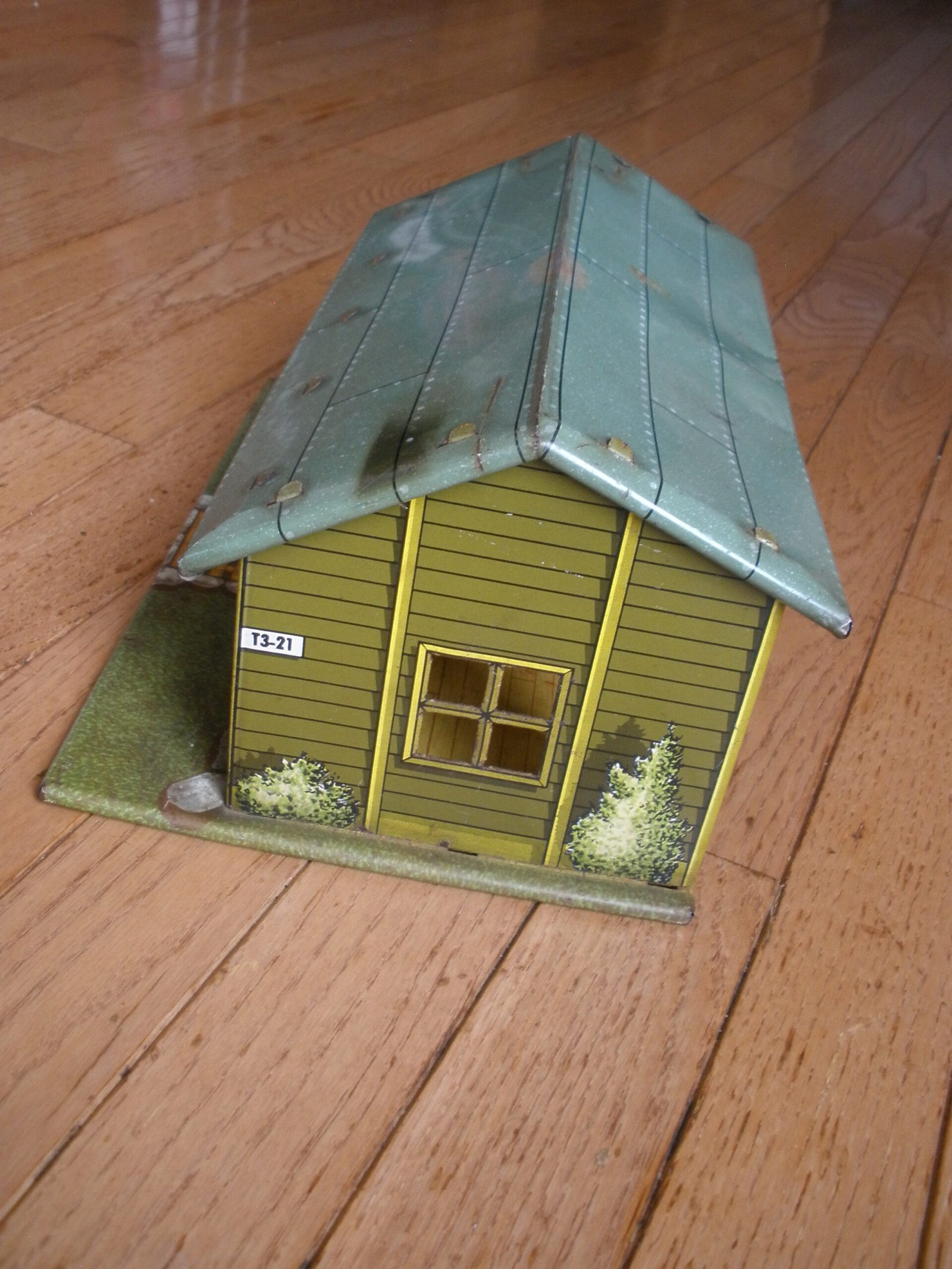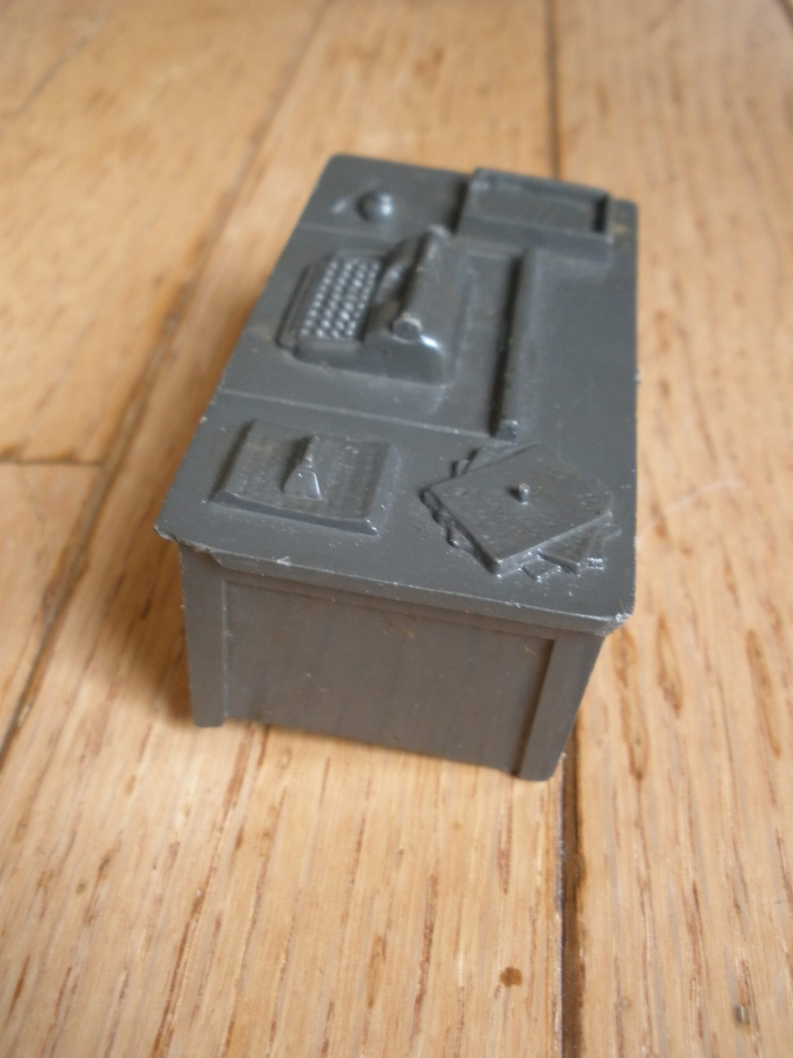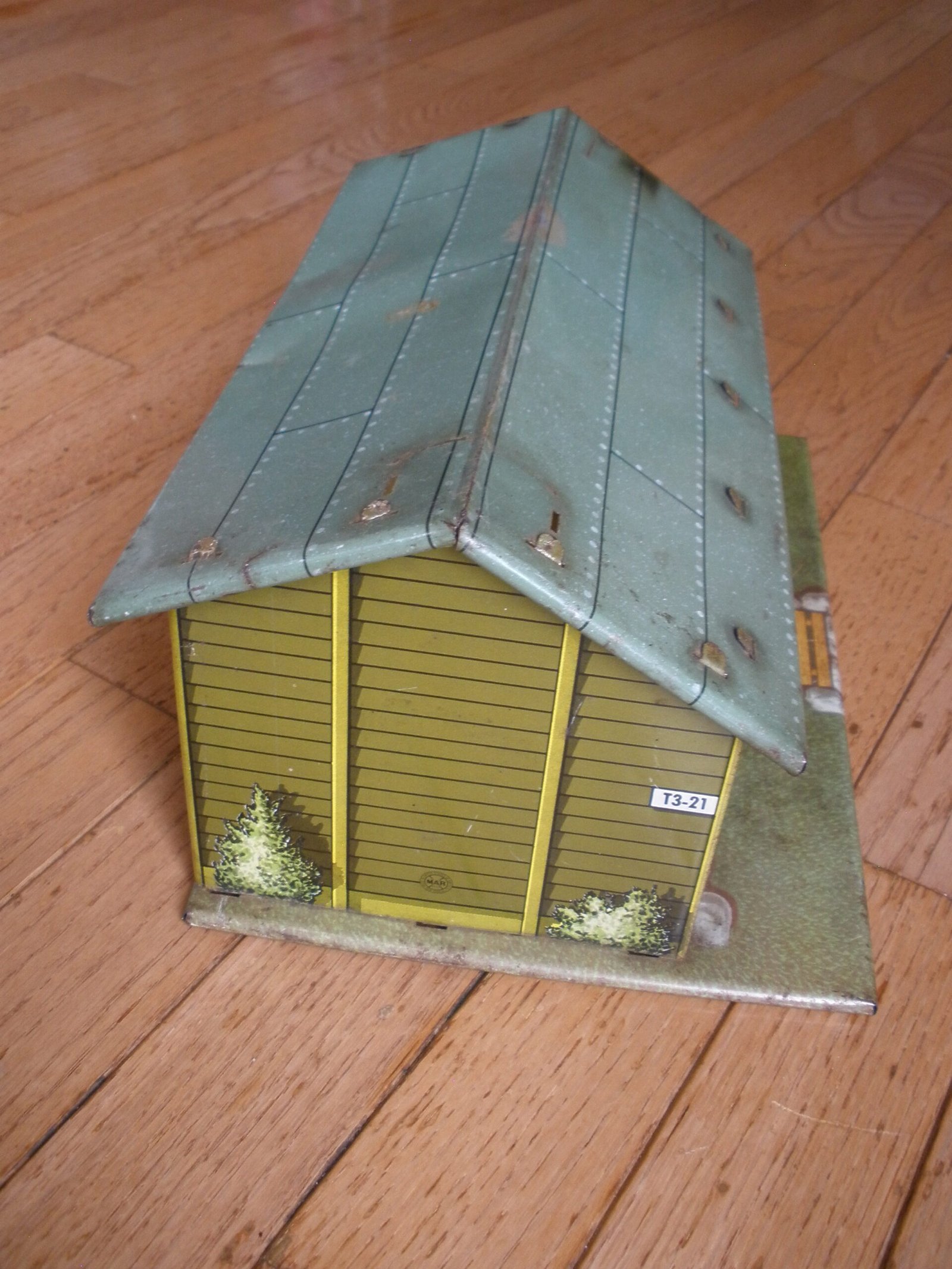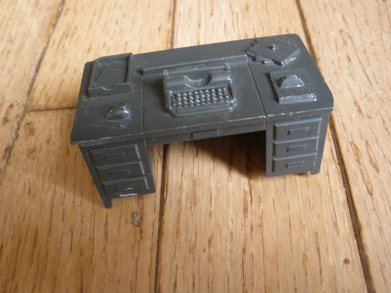 For sale is a 1950s MARX US ARMY HEADQUARTERS TRAINING CENTER Model T3-21 made by the Louis MARX toy company. This military themed lithographic toy is in very good condition with vivid color and a small amount of spot rust. The sale includes a green plastic toy desk with a typewriter on top of the desk. This desk was sold as one of the accessories which was included with the purchase of the Marx HQ Training Center. As you would expect, the Training Center accessories are significantly harder to find then the Training Center building. On the interior of the model training center the graphics on the wall include a Manning Status board, mail box slots, a fire extinguisher and a calendar. The graphics are very detailed. For example, on the manning status board, a soldier from Company A is marked as “AWOL” which stands for Absence Without Leave. More disturbing is the fact that all four Companies have personnel admitted to the hospital and there is a total of 16 soldiers on K.P. duty. In the Army, “KP duty” (Kitchen Police or Kitchen Patrol) refers to the task of assisting kitchen staff with cleaning and other support duties in dining facilities, such as mess halls. The toy measures about 11 inches long, 7 inches wide, and 5 1/4 inches tall. A great collectible Marx Toy.