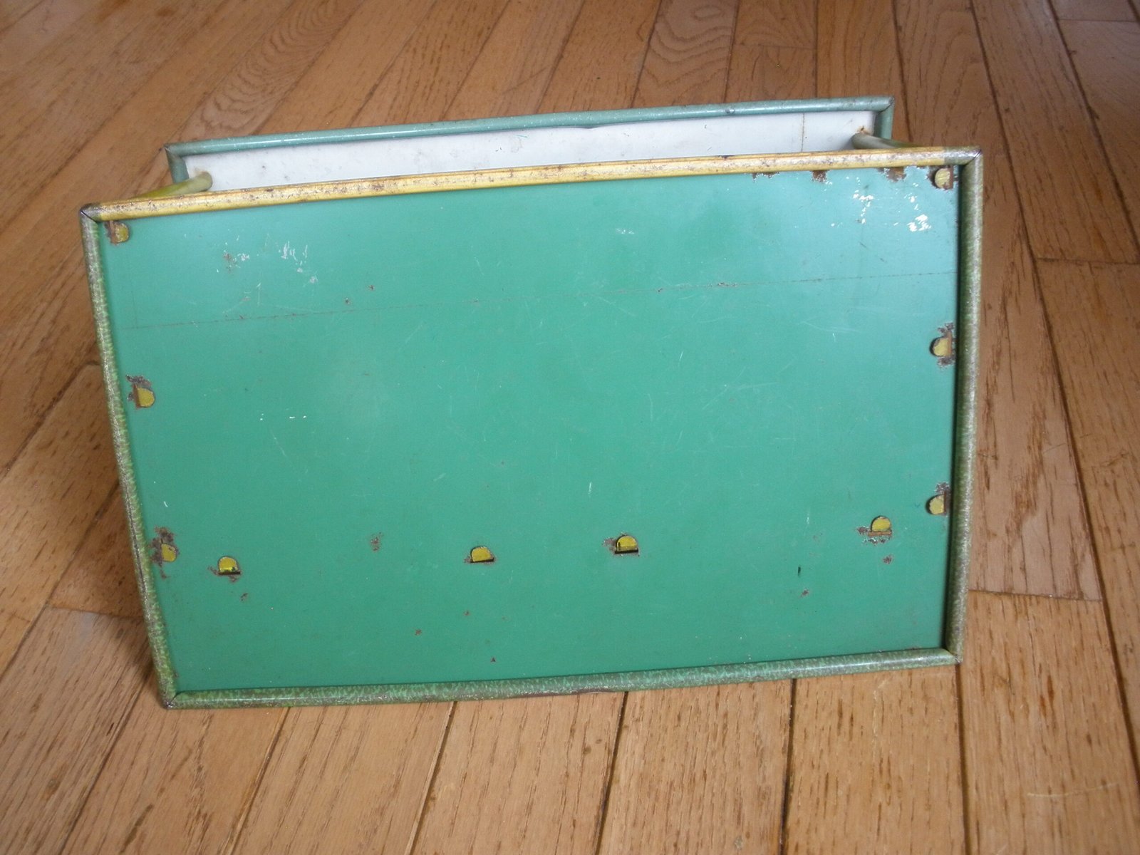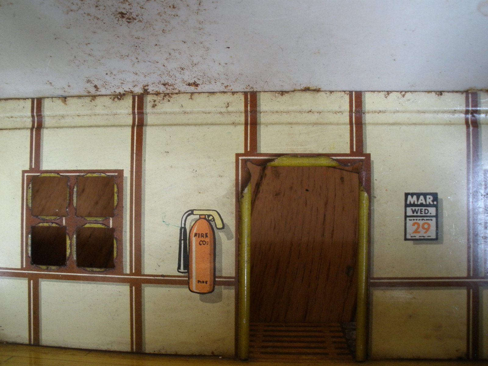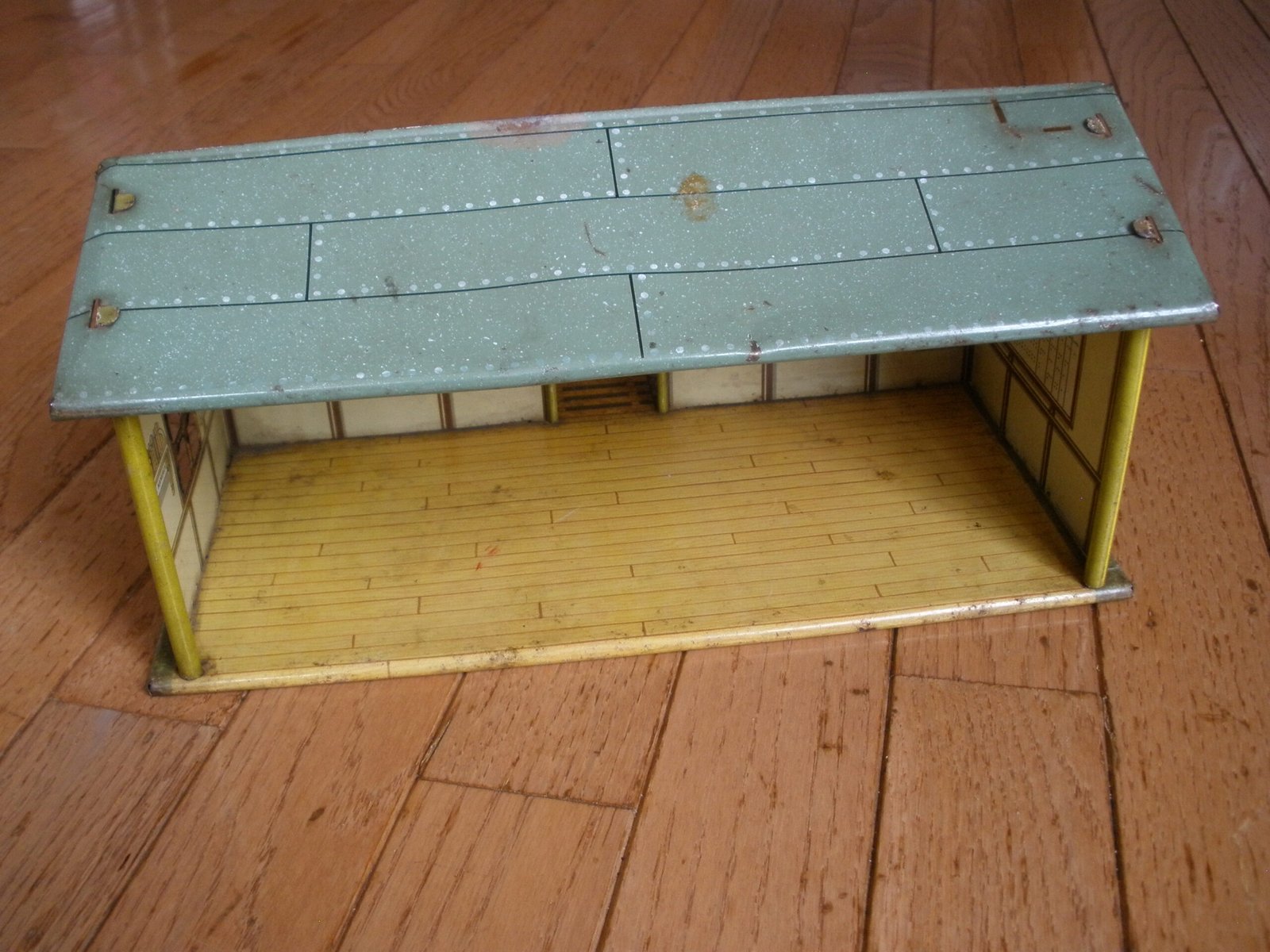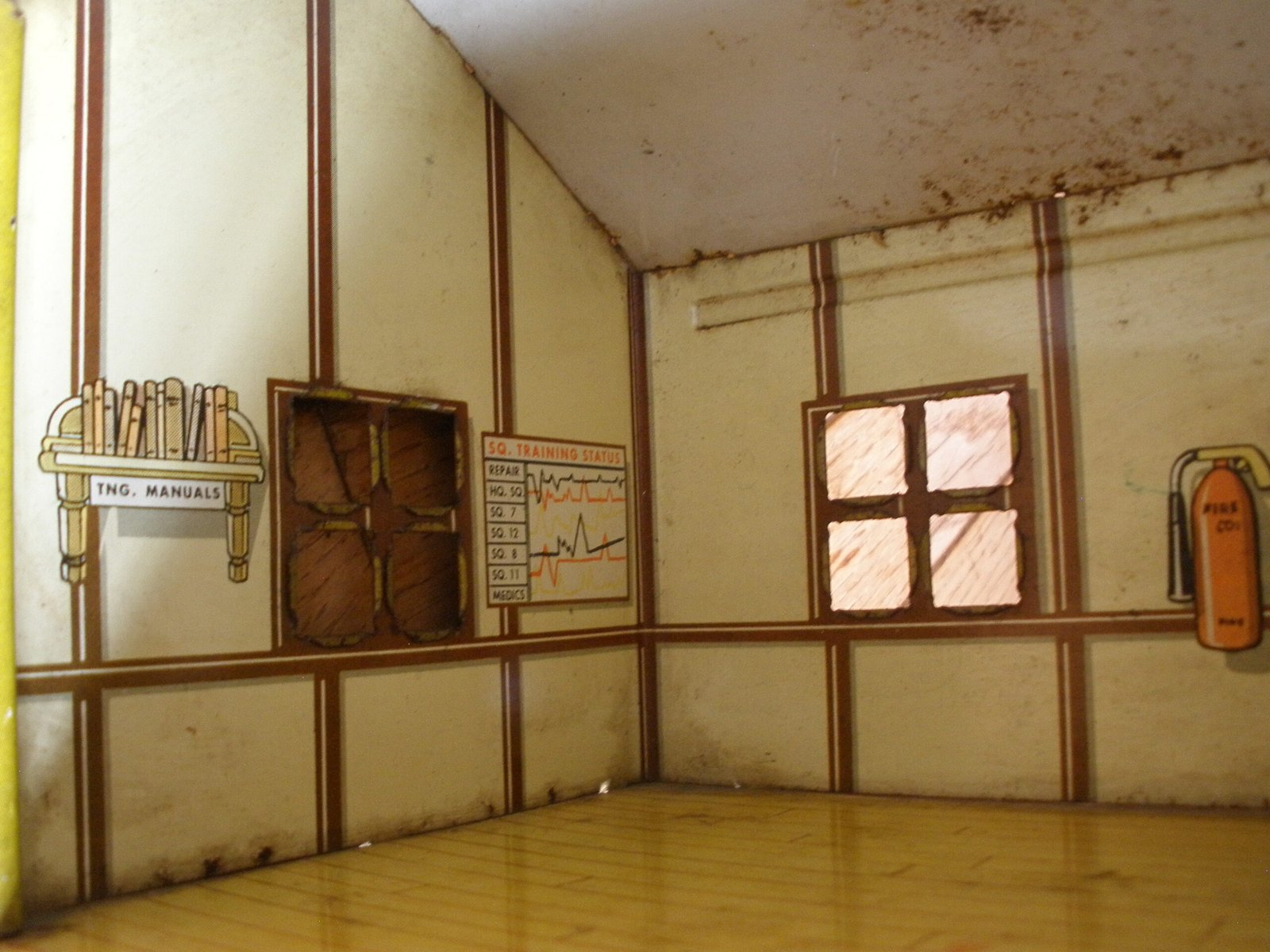 For sale is a 1950s MARX US ARMY HEADQUARTERS TRAINING CENTER Model T3-21 made by the Louis MARX toy company. This military themed lithographic toy is in very good condition with vivid color and a small amount of spot rust. The sale includes a green plastic toy desk with a typewriter on top of the desk. This desk was sold as one of the accessories which was included with the purchase of the Marx HQ Training Center. As you would expect, the Training Center accessories are significantly harder to find then the Training Center building. On the interior of the model training center the graphics on the wall include a Manning Status board, mail box slots, a fire extinguisher and a calendar. The graphics are very detailed. For example, on the manning status board, a soldier from Company A is marked as “AWOL” which stands for Absence Without Leave. More disturbing is the fact that all four Companies have personnel admitted to the hospital and there is a total of 16 soldiers on K.P. duty. In the Army, “KP duty” (Kitchen Police or Kitchen Patrol) refers to the task of assisting kitchen staff with cleaning and other support duties in dining facilities, such as mess halls. The toy measures about 11 inches long, 7 inches wide, and 5 1/4 inches tall. A great collectible Marx Toy.