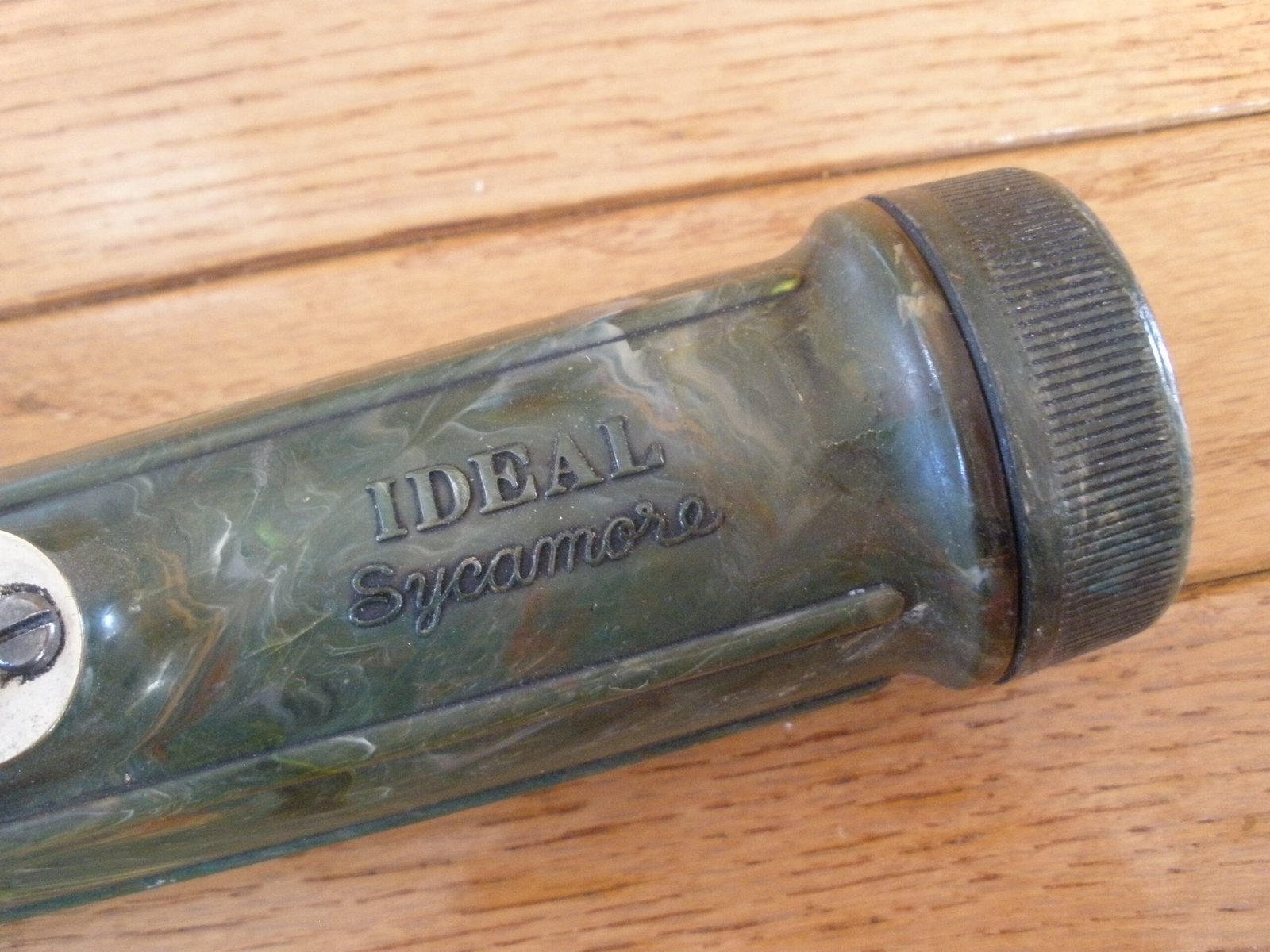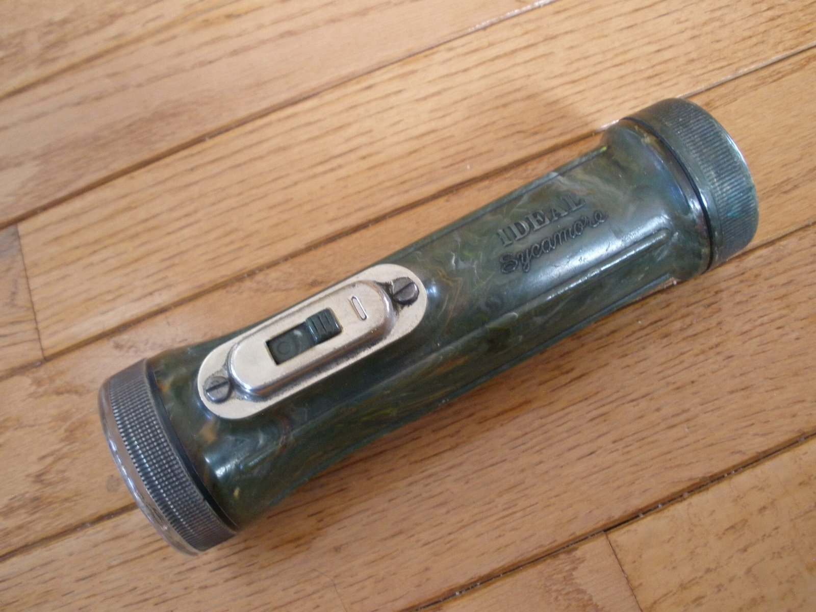 For sale is a 1960s IDEAL SYCAMORE FLASHLIGHT made by Ideal Industries, Sycamore, Illinois. This flashlight has an unusual marbled plastic body. This flashlight stands about 7 inches tall and has a 2 inch diameter lens. This battery powered flashlight is untested. A nice collectible vintage flashlight.