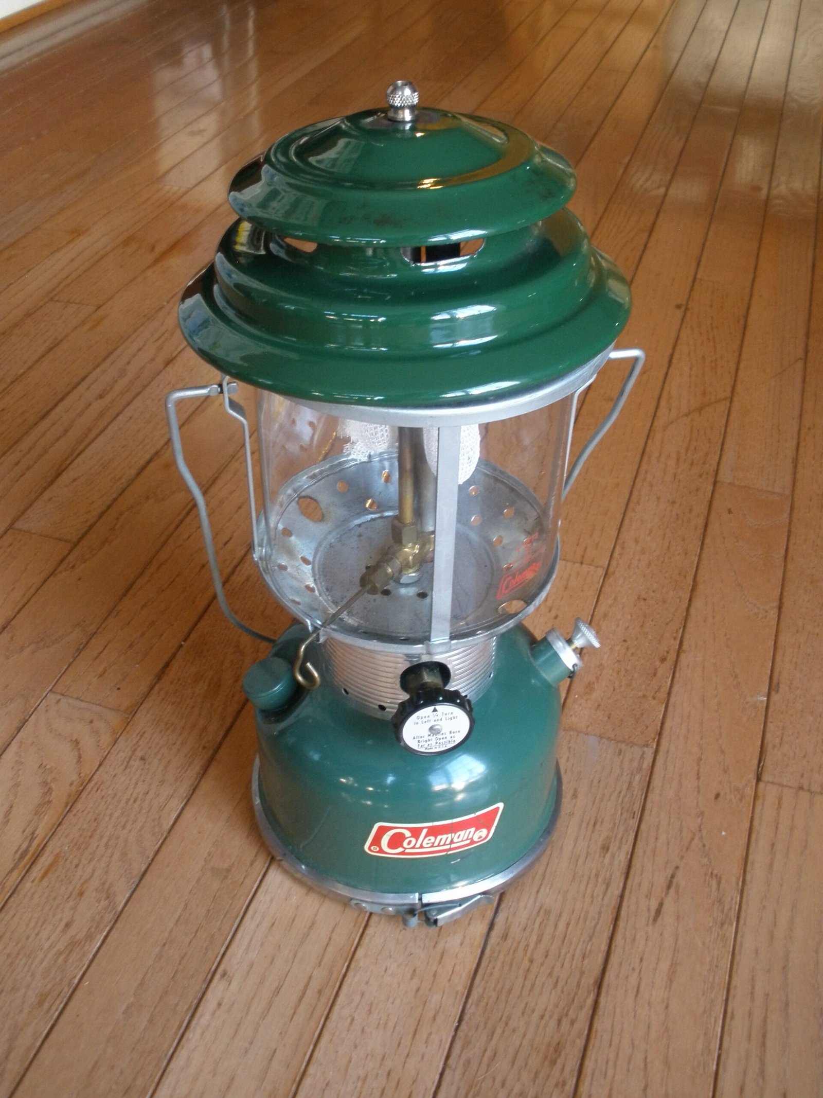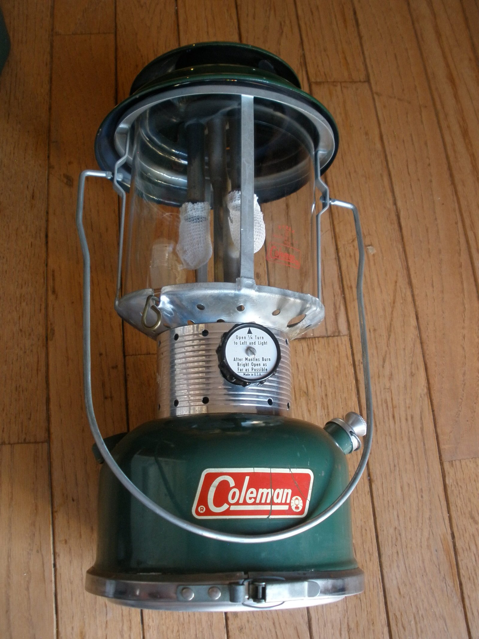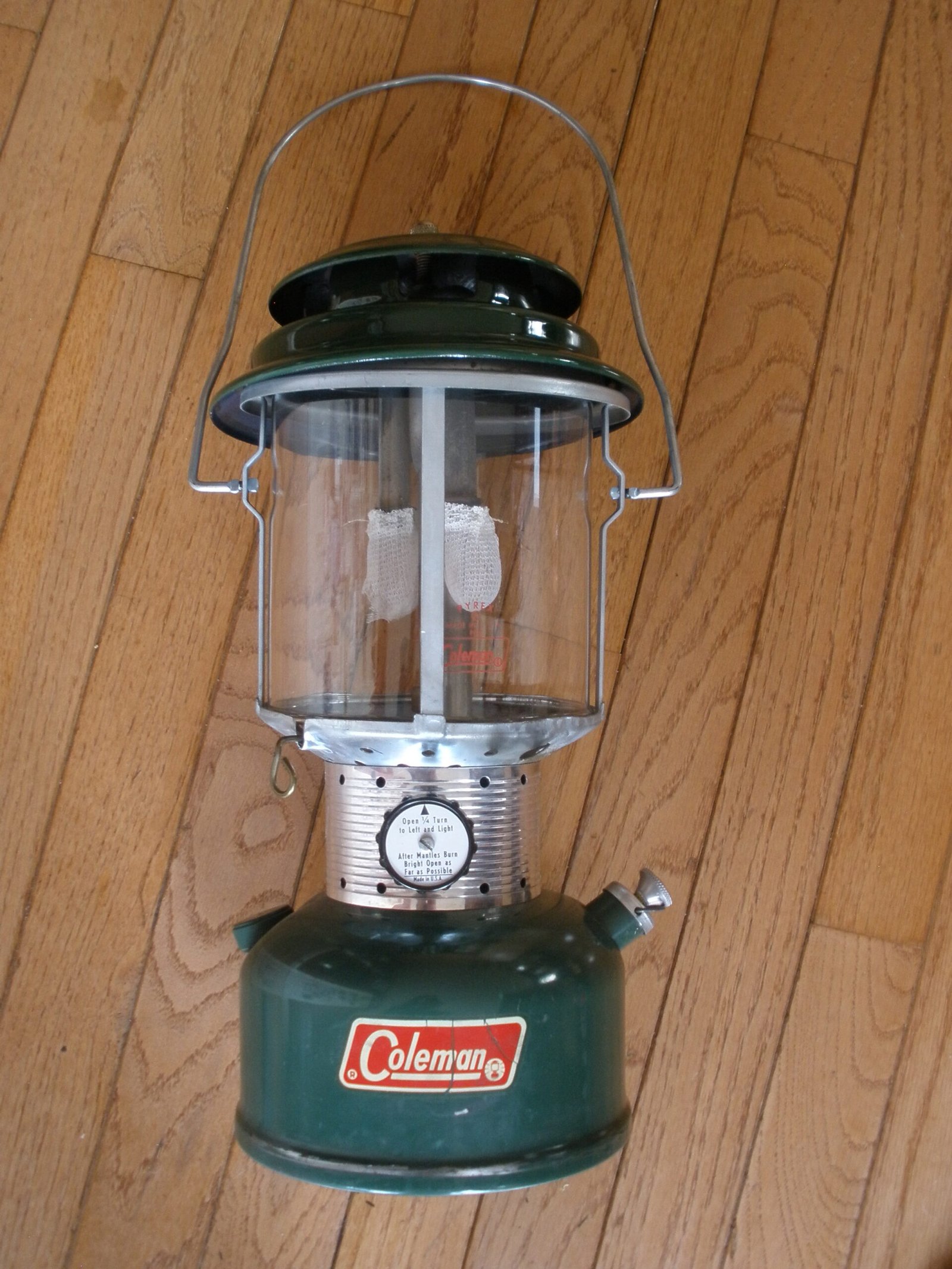 In 1914, the Coleman company started to manufacture a line of pressure lamps. Their original lamps were made to burn kerosene or gasoline. Current models use kerosene, gasoline, Coleman fuel (white gas) or propane and use one or two mantles to produce an intense white light.