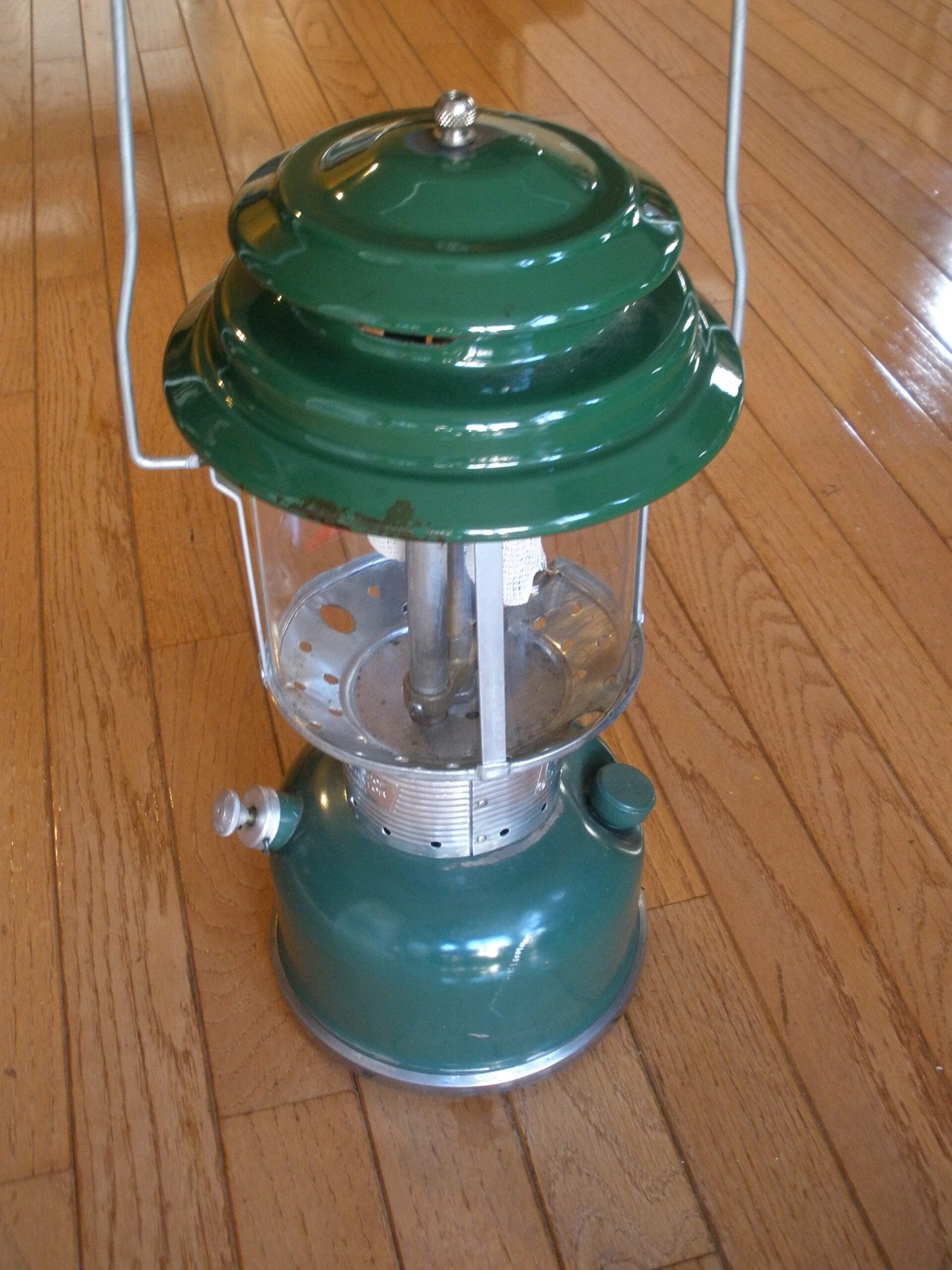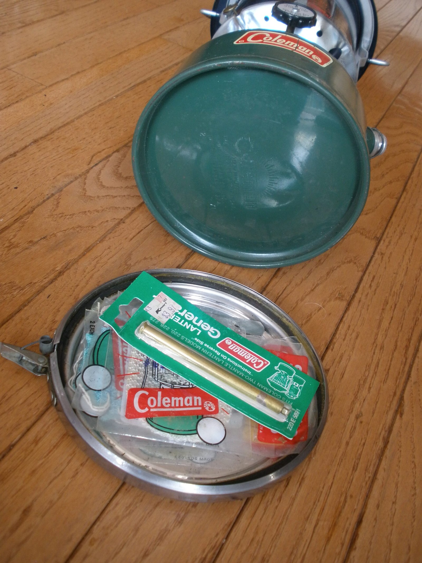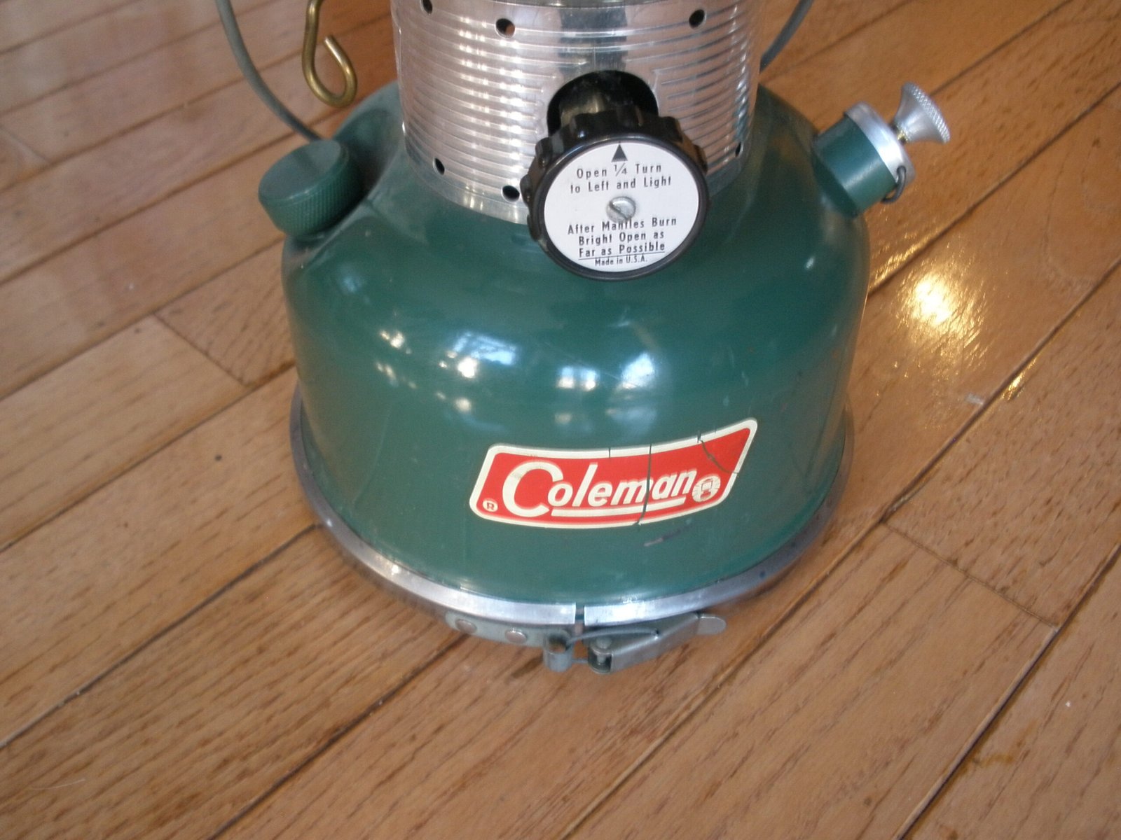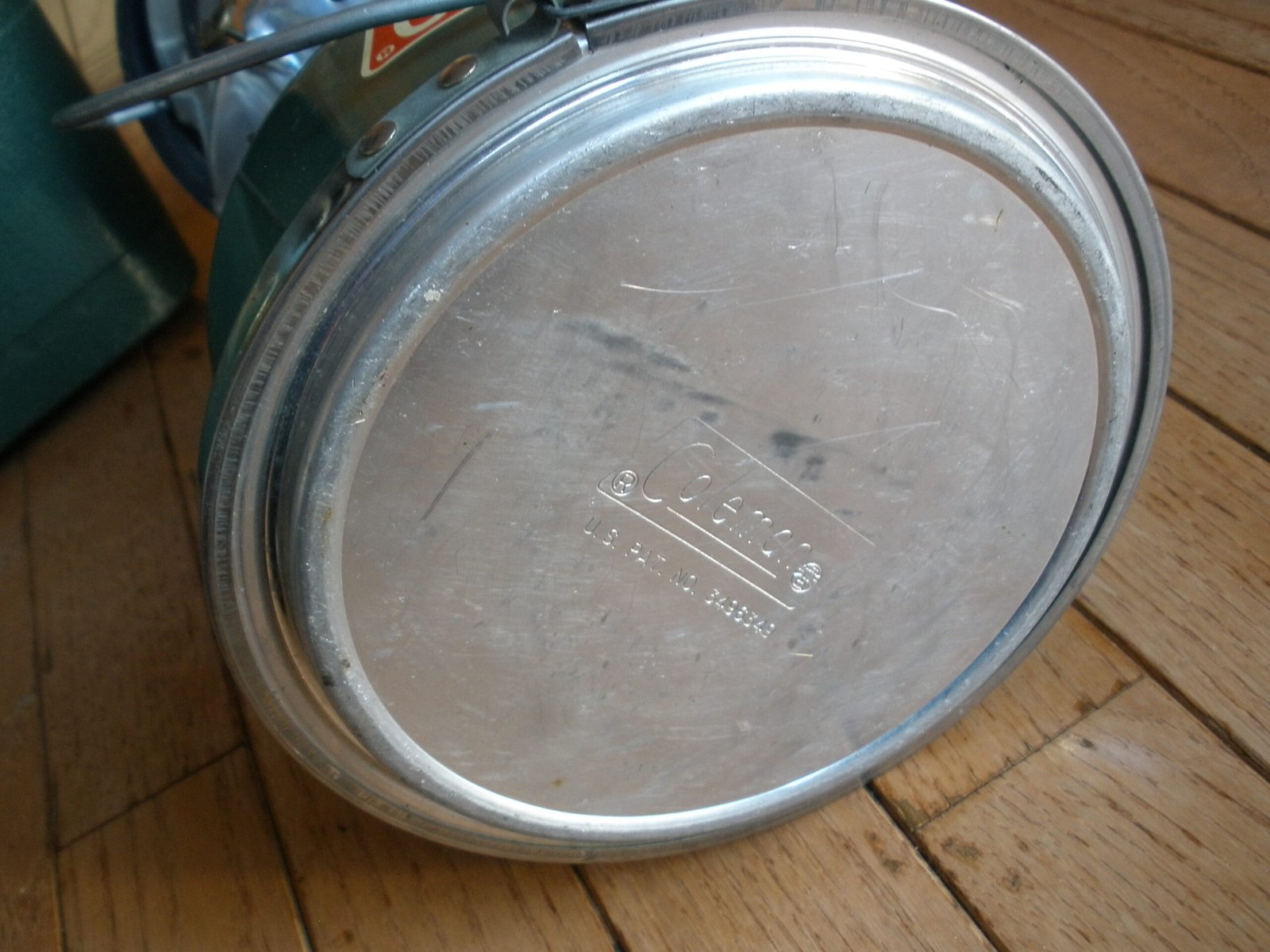 This green lantern sale also includes a detachable storage compartment for the bottom of the lantern. The storage compartment is is marked with a patent number 3496349 which was filed in 1966. The compartment includes a shallow pan and a split draw band located about the pan and adapted to fit over a lower peripheral rim of the base of the lantern. The compartment provides a convenient place to safekeep replaceable elements by providing a detachable accessory compartment secured beneath the lantern for storage of replaceable elements, tools, matches and the like. This includes multiple silk mantles, a wrench, and a lantern cleaning rod.