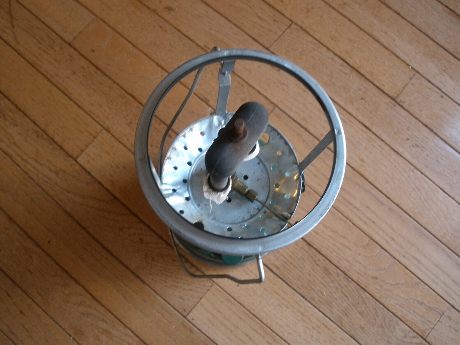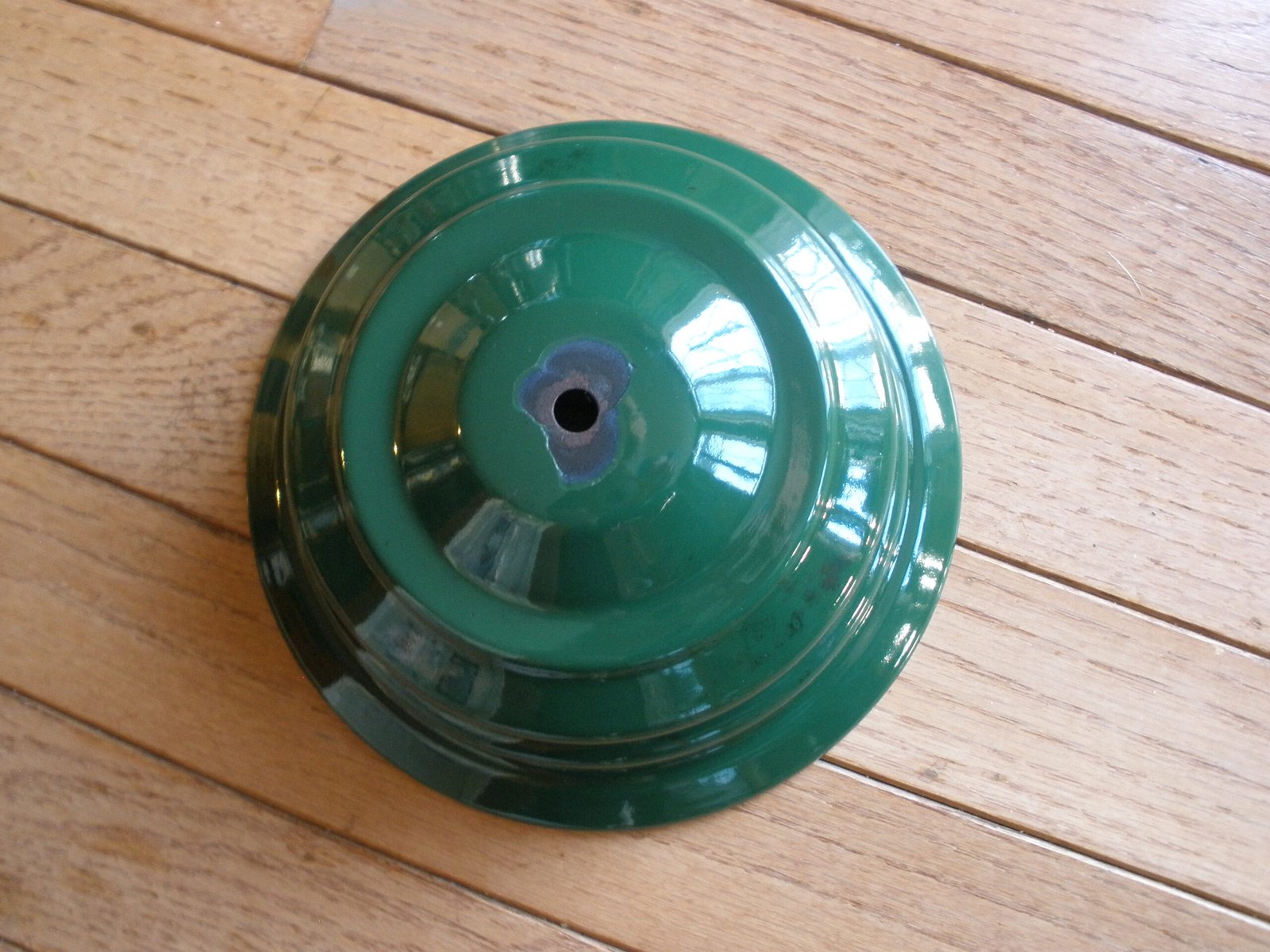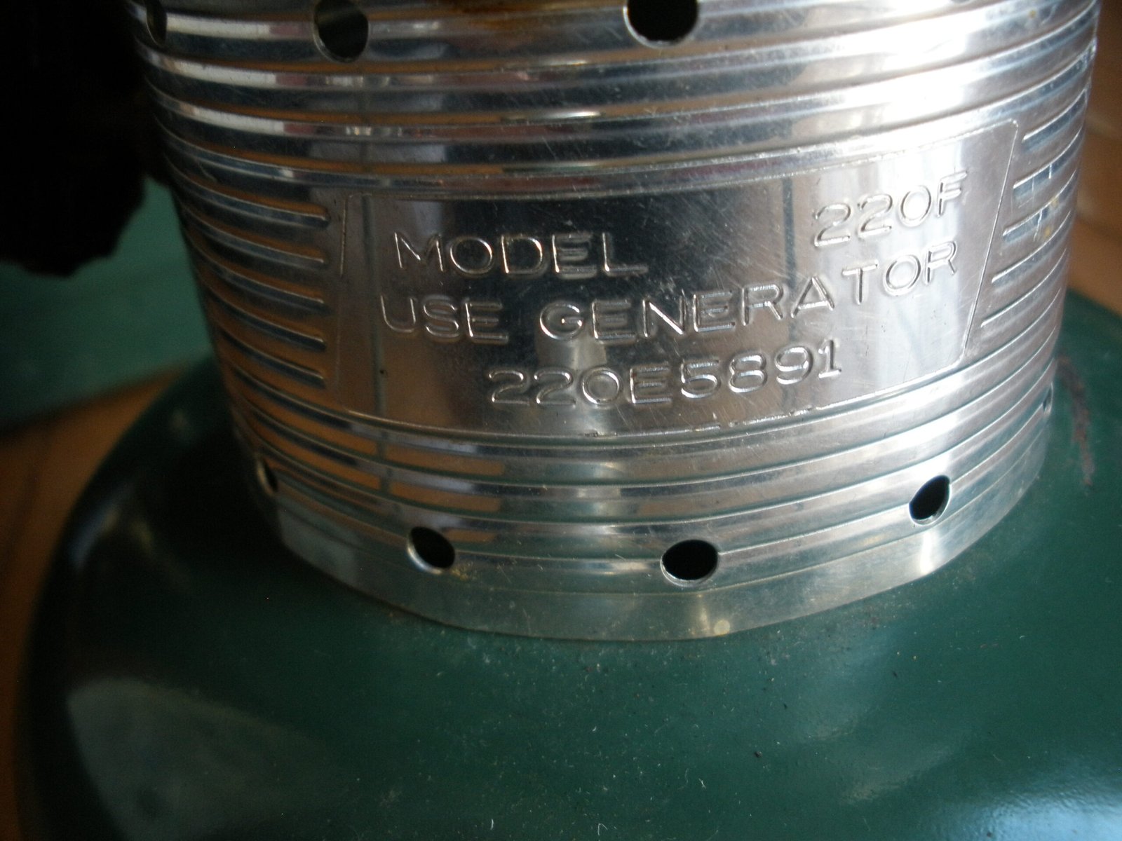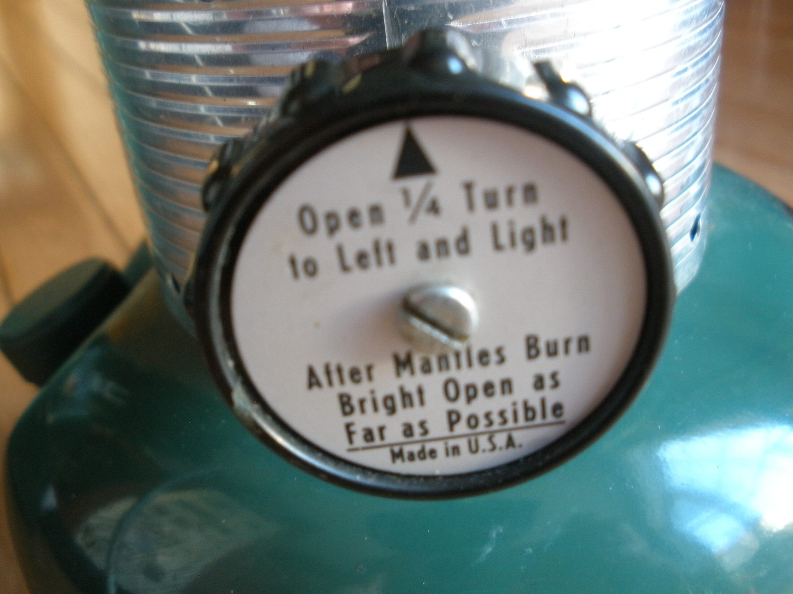 This green lantern sale also includes a detachable storage compartment for the bottom of the lantern. The storage compartment is is marked with a patent number 3496349 which was filed in 1966. The compartment includes a shallow pan and a split draw band located about the pan and adapted to fit over a lower peripheral rim of the base of the lantern. The compartment provides a convenient place to safekeep replaceable elements by providing a detachable accessory compartment secured beneath the lantern for storage of replaceable elements, tools, matches and the like. This includes multiple silk mantles, a wrench, and a lantern cleaning rod.