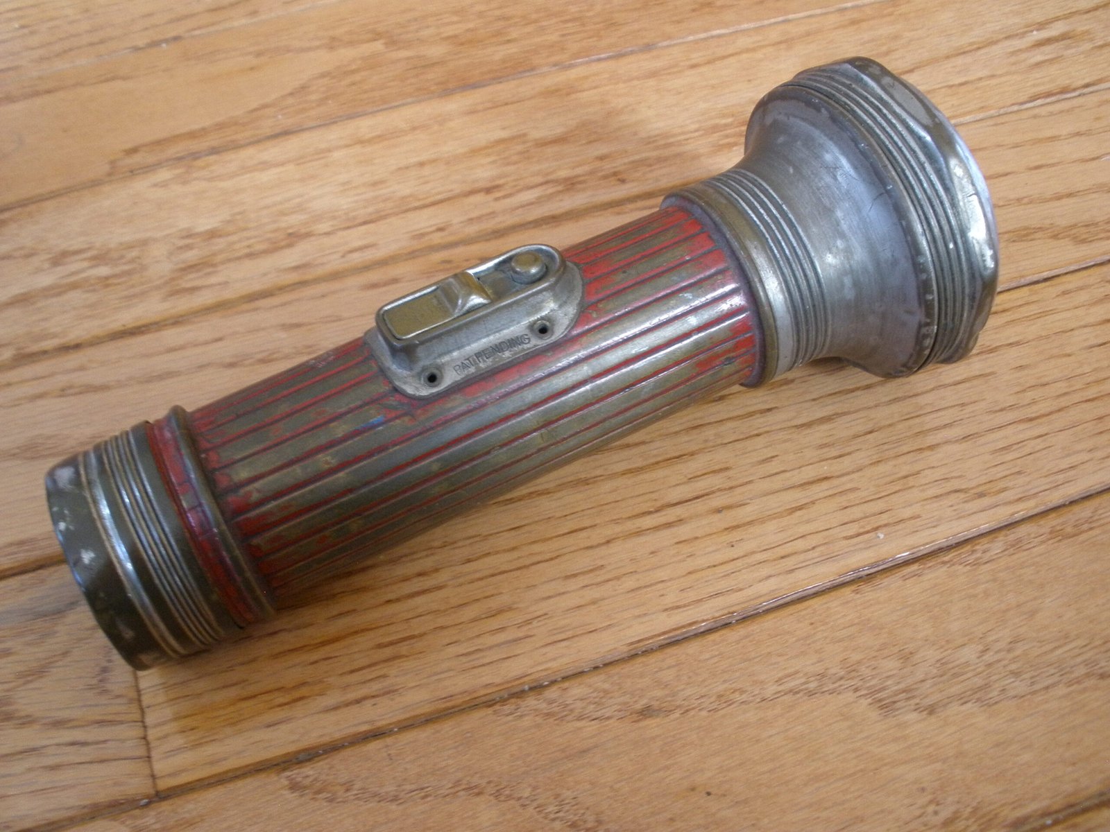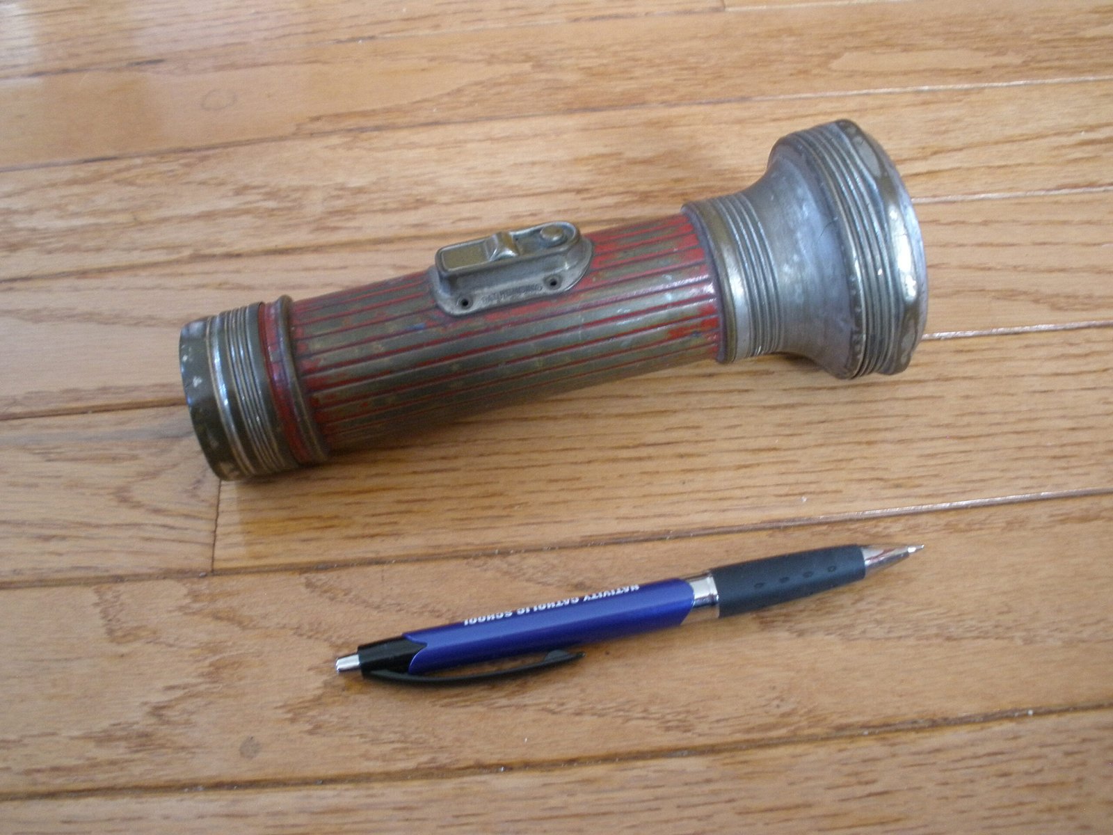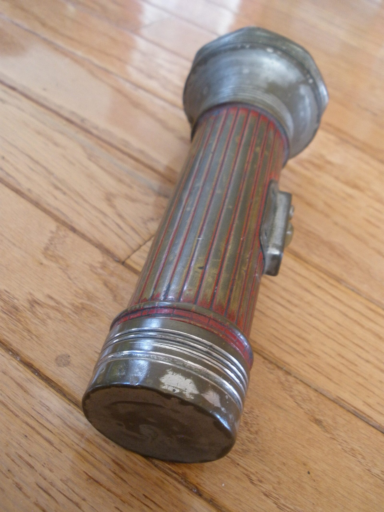 For sale is a MID-CENTURY BRASS FLASHLIGHT from an unknown manufacturer. This brass flashlight has a ribbed design with a slide switch. This tall flashlight stands about 7 1/4 inches tall and has a 2 1/2 inch diameter glass lens. This battery powered flashlight is untested. A great collectible vintage flashlight.