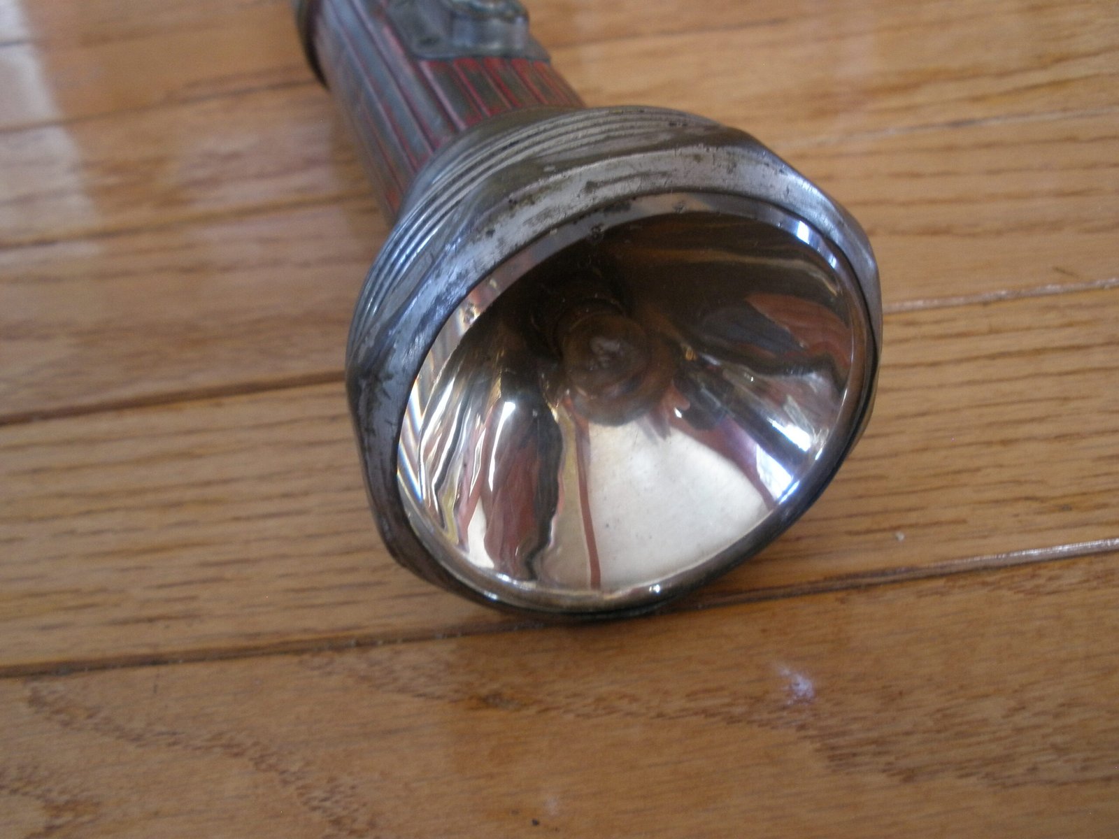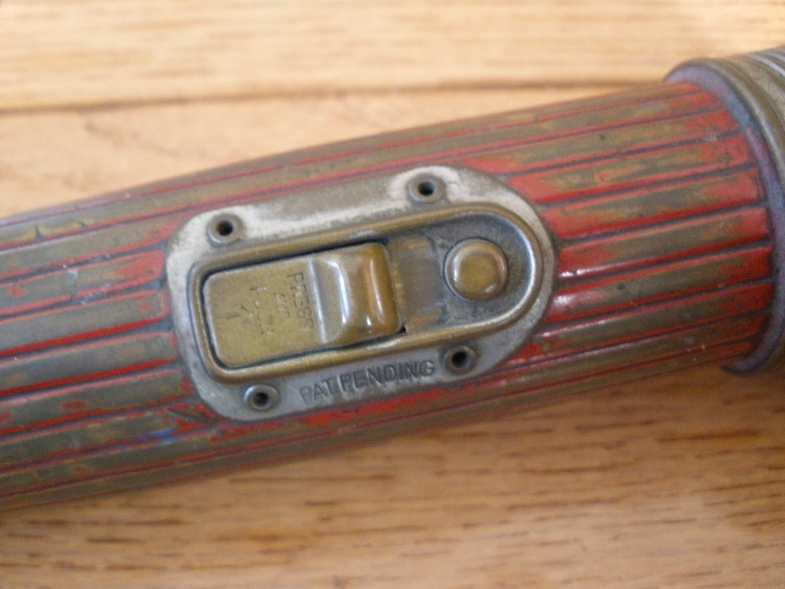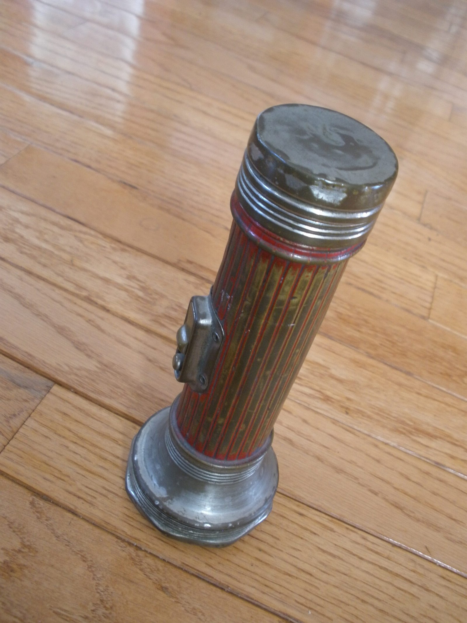 For sale is a MID-CENTURY BRASS FLASHLIGHT from an unknown manufacturer. This brass flashlight has a ribbed design with a slide switch. This tall flashlight stands about 7 1/4 inches tall and has a 2 1/2 inch diameter glass lens. This battery powered flashlight is untested. A great collectible vintage flashlight.