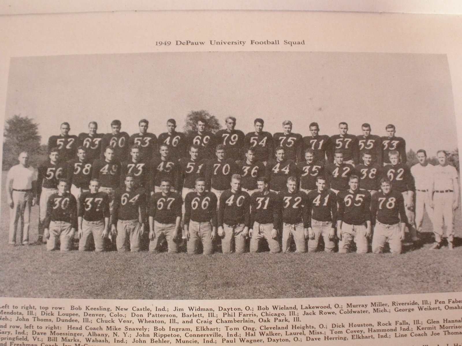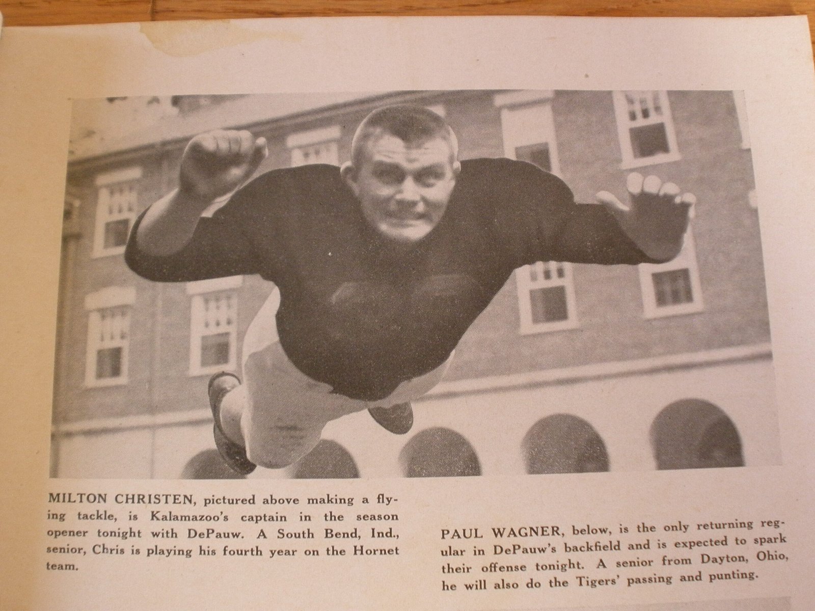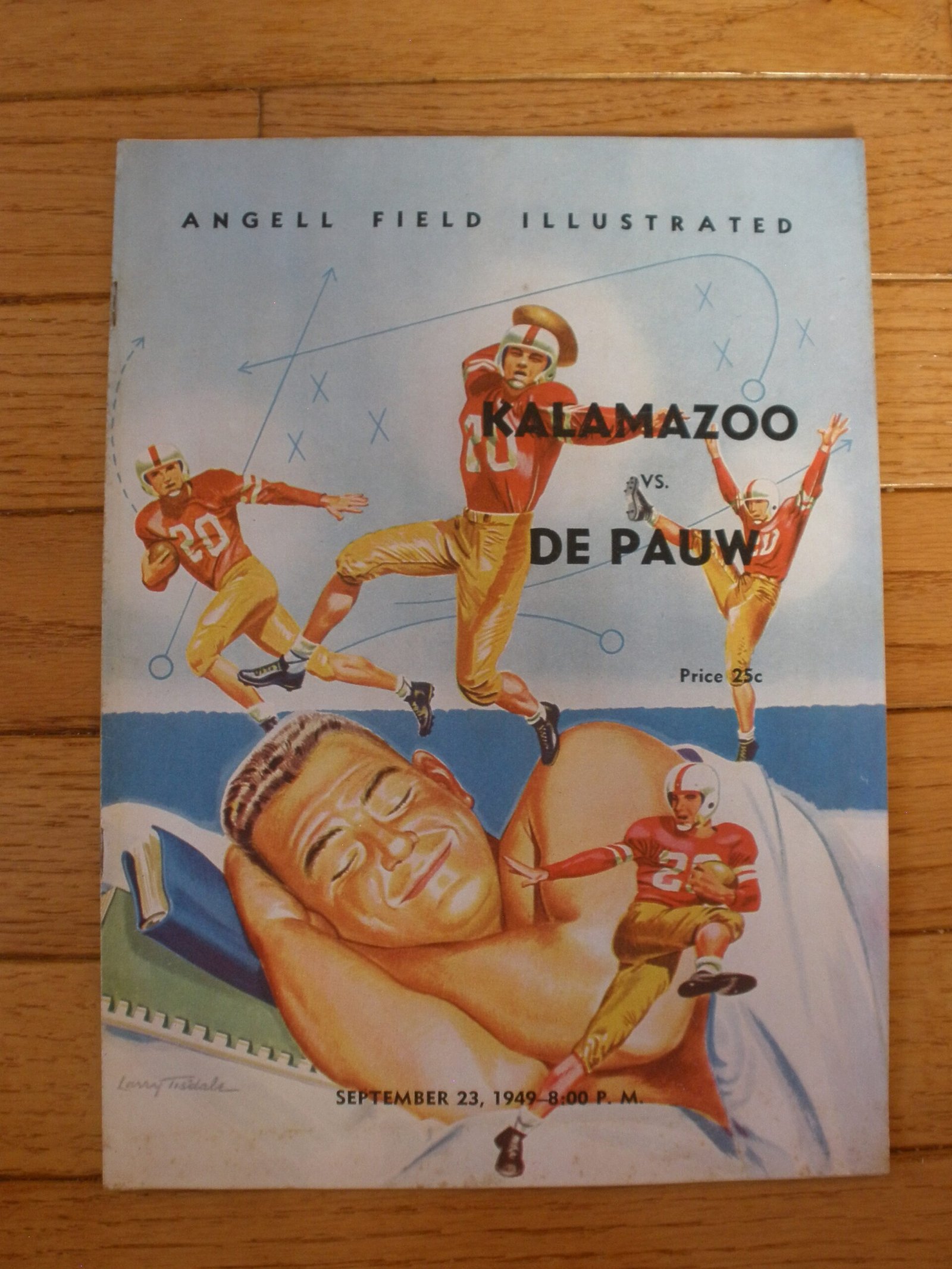 For sale is an ORIGINAL 1949 KALAMAZOO COLLEGE versus DE PAUW UNIVERSITY FOOTBALL PROGRAM. The full color glossy cover of this program depicts a sleeping man dreaming of football glory. The program was printed for a NCAA Football game that occurred on September 23, 1949. This 20-page program is complete and in good condition with no torn pages. The program contents features player photos, cartoon panels, and a variety of ads from local businesses. A great collectible from the leatherheads era of football.