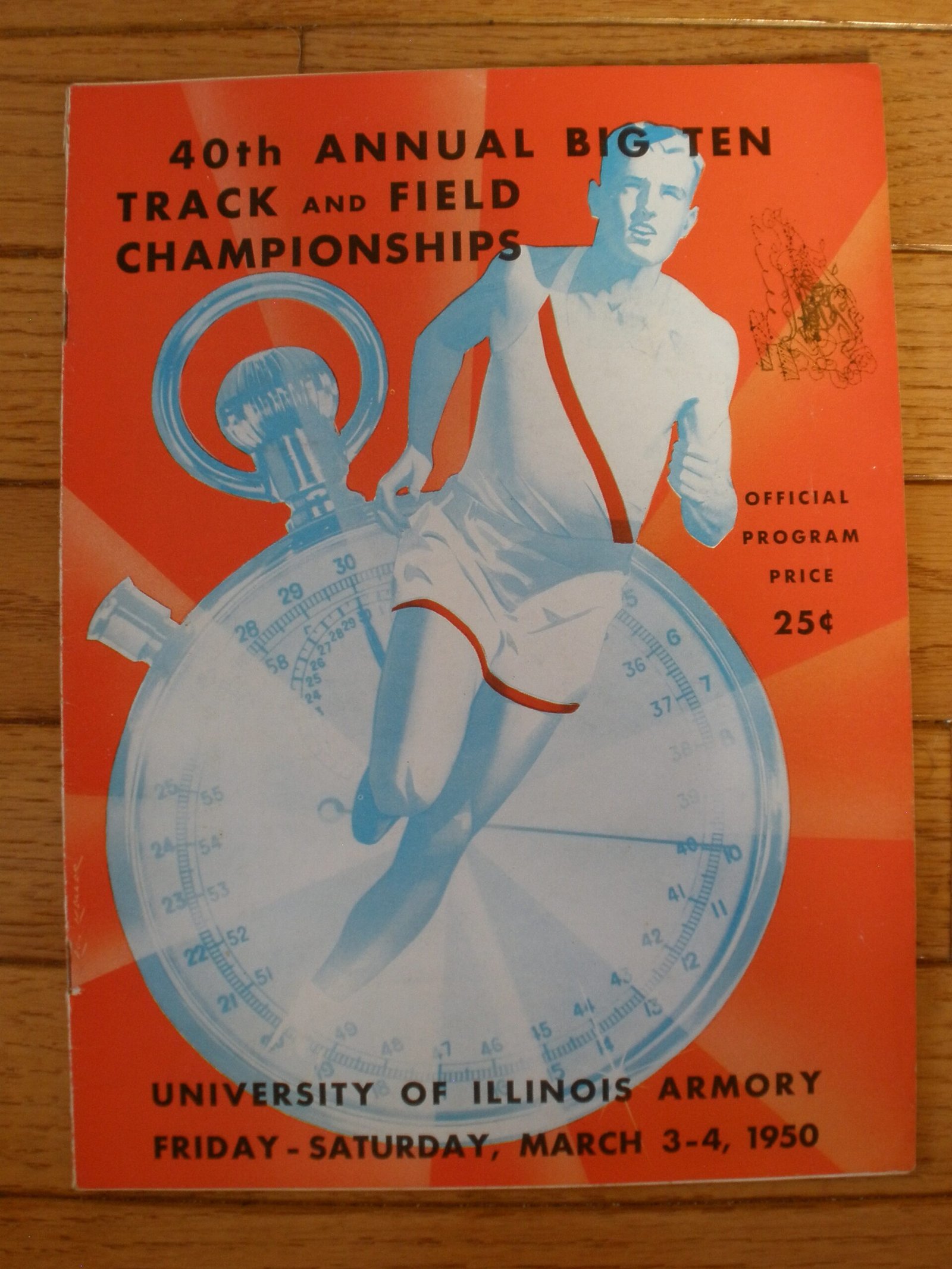 For sale is an ORIGINAL 1950 40th ANNUAL BIG TEN TRACK & FIELD CHAMPIONSHIP PROGRAM. The full color cover of this glossary program depicts a sprinter and a stopwatch. The program was printed for a college track meet that occurred in Chicago on March 3 and 4, 1950. This 26-page program is complete and in good condition but some of the interior pages have some pencil notations. The program contents features team rosters for the competing Universities (Illinois, Iowa, Michigan, Minnesota, Northwestern, Ohio State, Purdue, Wisconsin, and Indiana). The program has coach and athlete photos, a variety of ads from local businesses and a Gregory Peck Chesterfield cigarette advert. The program also includes track records which were in effect at the time of the meet. For example, the record time for the one-mile event was 4:04. The program original sold for 25 cents. A great sports collectible.